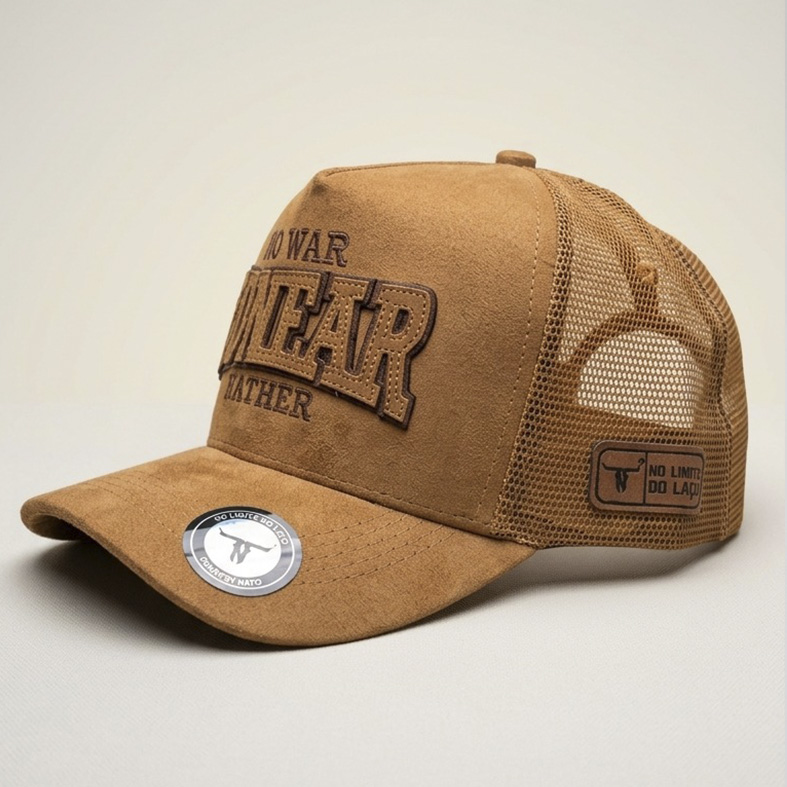 A aba curva segue o mesmo acabamento em tecido tipo suede, garantindo um toque macio e visual premium. Já a parte traseira em tela (mesh) proporciona maior ventilação e conforto, ideal para o uso no dia a dia.